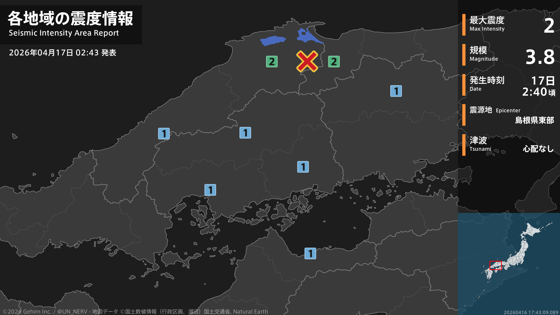 【地震情報 2026年4月17日】2時40分頃、島根県東部を震源とする地震がありました。震源の深さは約20km、地震の規模はM3.8、最大震度2を鳥取県、島根県で観測しています。この地震による津波の心配はありません。#地震 #鳥取県 #島根県 #岡山県 #広島県 #愛媛県