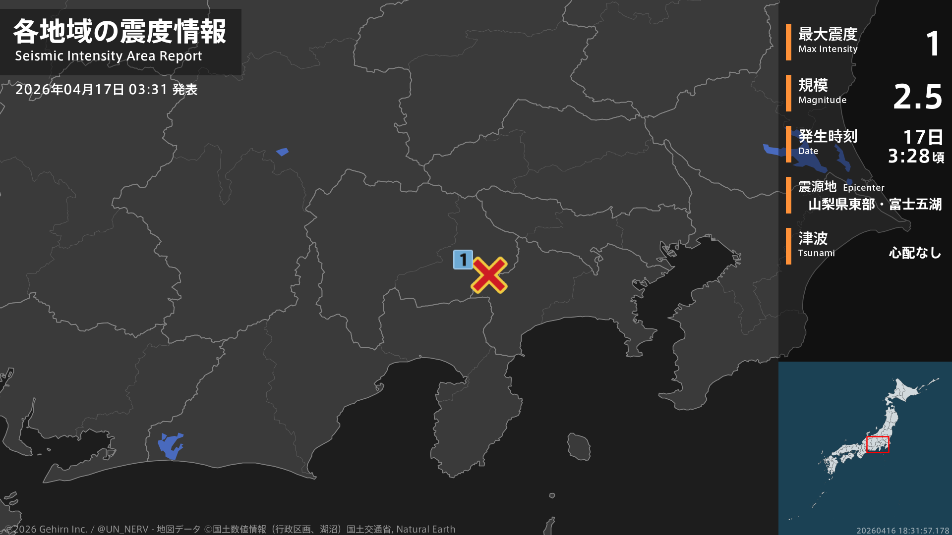 【地震情報 2026年4月17日】3時28分頃、山梨県東部・富士五湖を震源とする地震がありました。震源の深さは約20km、地震の規模はM2.5、最大震度1を山梨県で観測しています。この地震による津波の心配はありません。#地震 #山梨県