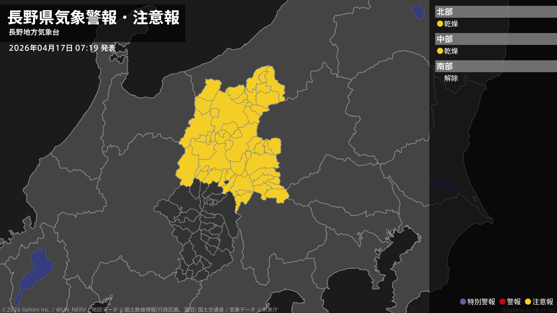 【長野県 気象警報・注意報 2026年04月17日 07:19】北部では17日まで、中部では18日まで、空気の乾燥した状態が続くため、火の取り扱いに注意してください。#気象警報注意報 #長野県