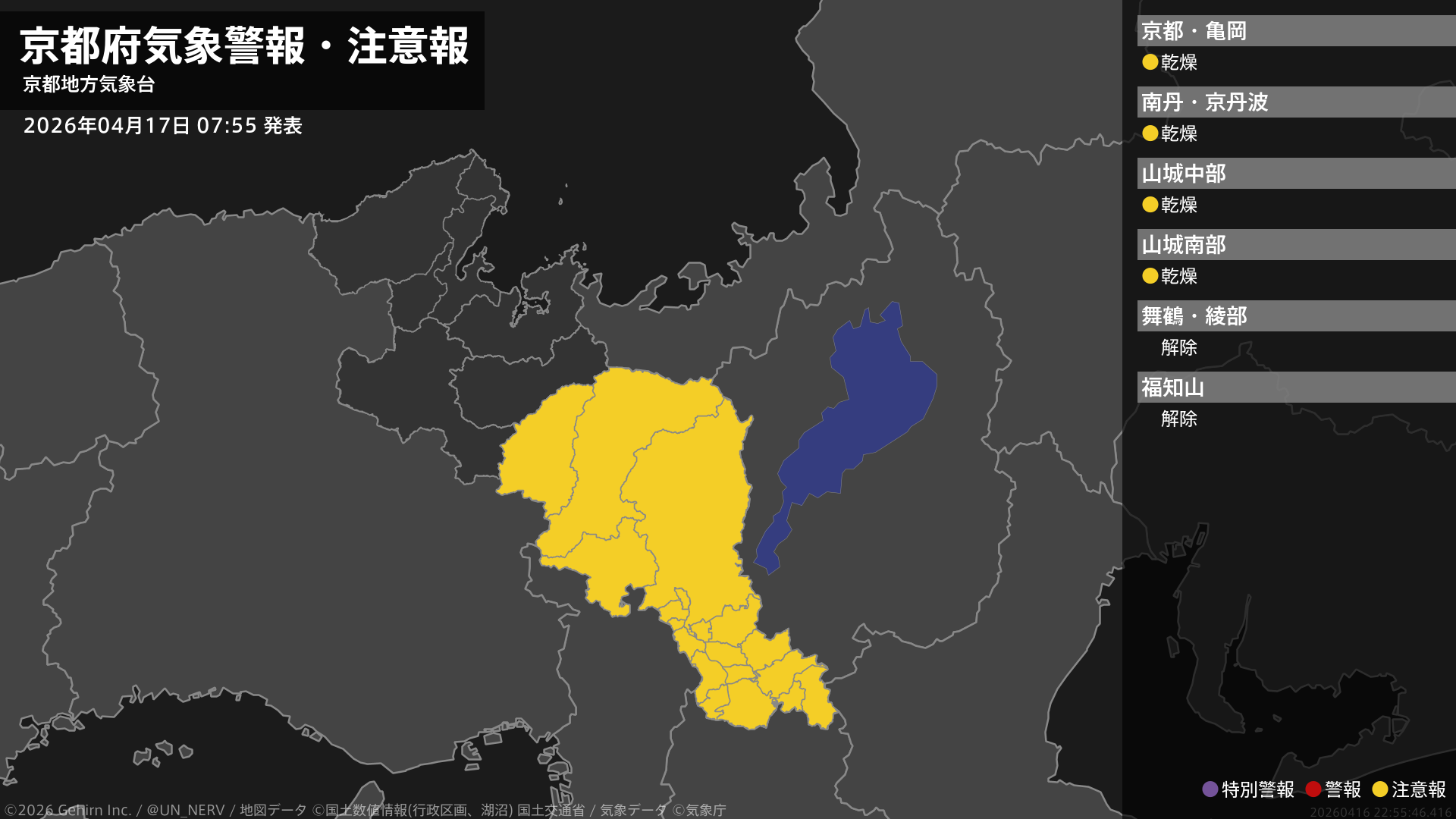 【京都府 気象警報・注意報 2026年04月17日 07:55】南部では、18日まで空気の乾燥した状態が続くため、火の取り扱いに注意してください。#気象警報注意報 #京都府