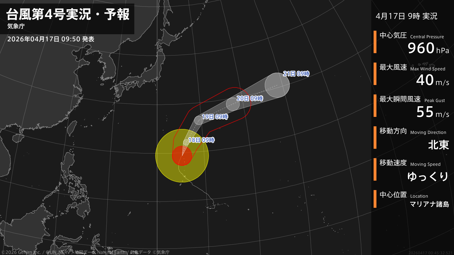 【台風第4号実況・予報 2026年04月17日 09:45】大型で強い台風第4号(シンラコウ)は、マリアナ諸島をゆっくりと北東に進んでいます。#台風情報