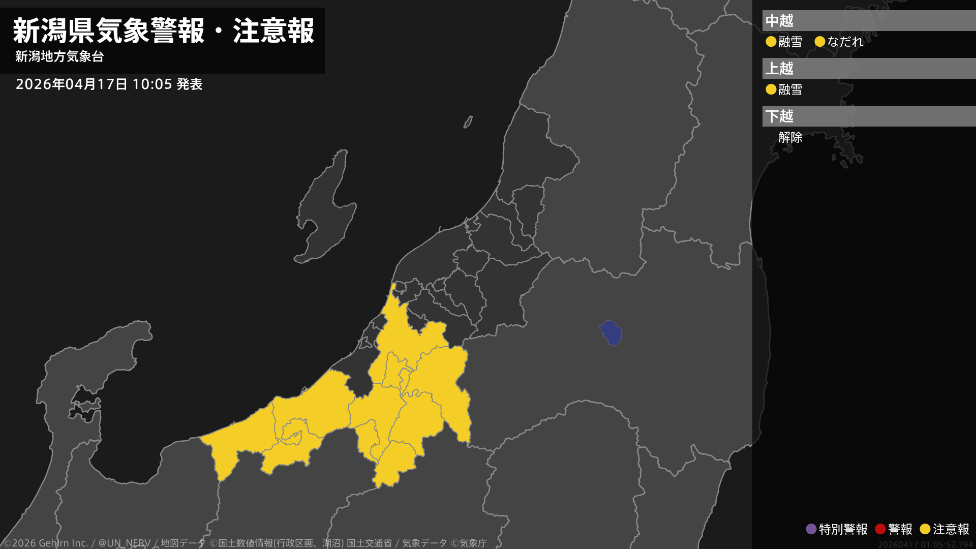 【新潟県 気象警報・注意報 2026年04月17日 10:05】中越、上越では、融雪による土砂災害に注意してください。中越では、なだれに注意してください。#気象警報注意報 #新潟県