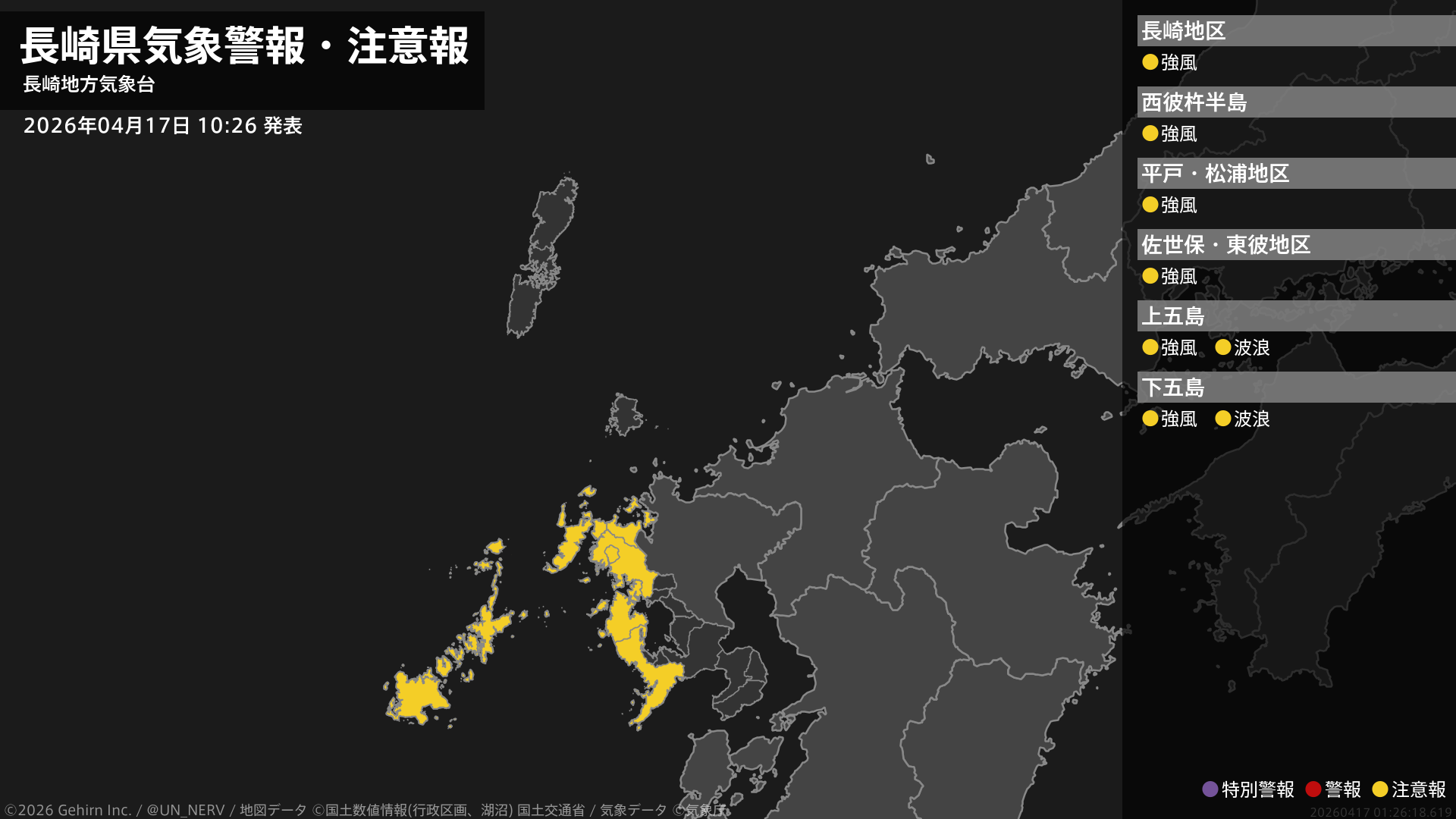 【長崎県 気象警報・注意報 2026年04月17日 10:26】北部、五島では18日未明まで、南部では17日夕方から18日未明まで、強風に注意してください。五島では、18日昼前まで高波に注意してください。#気象警報注意報 #長崎県