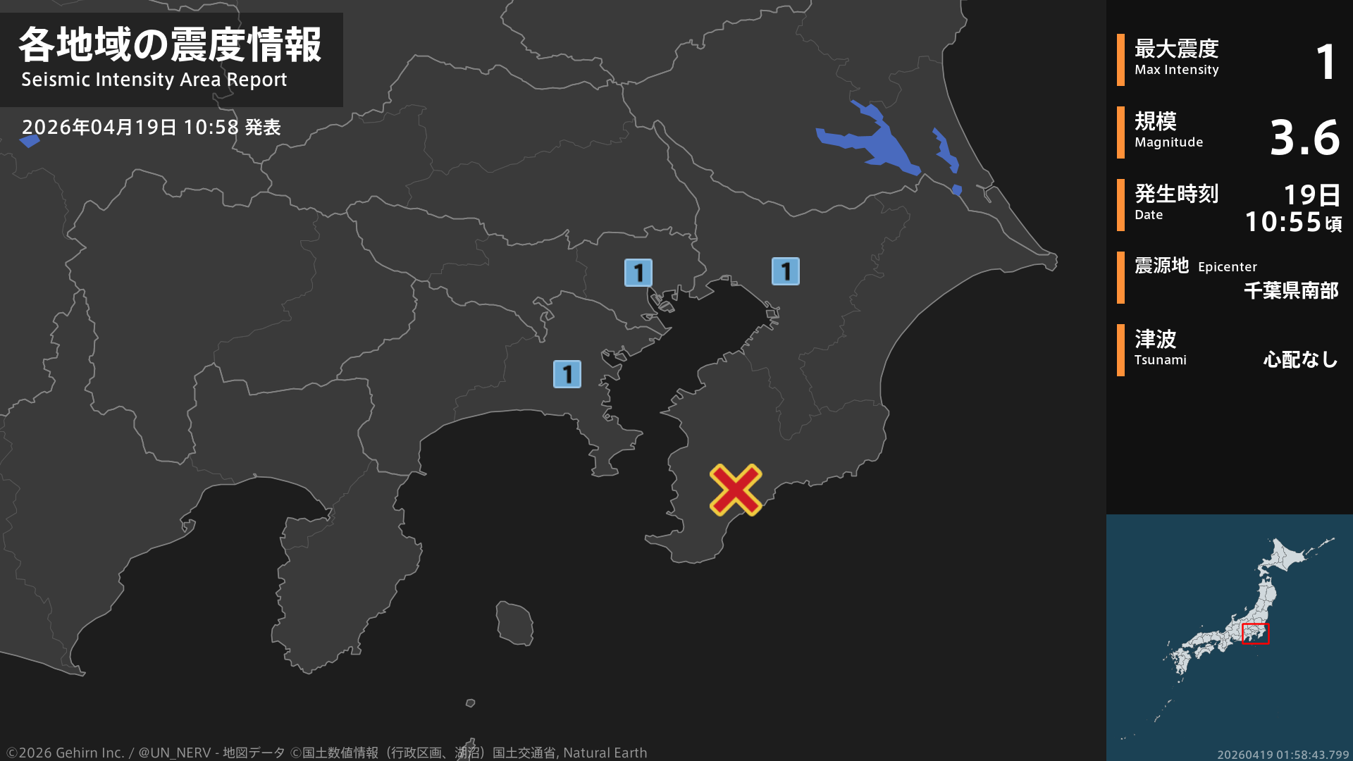 【地震情報 2026年4月19日】10時55分頃、千葉県南部を震源とする地震がありました。震源の深さは約70km、地震の規模はM3.6、最大震度1を千葉県、東京都、神奈川県で観測しています。この地震による津波の心配はありません。#地震 #千葉県 #東京都 #神奈川県
