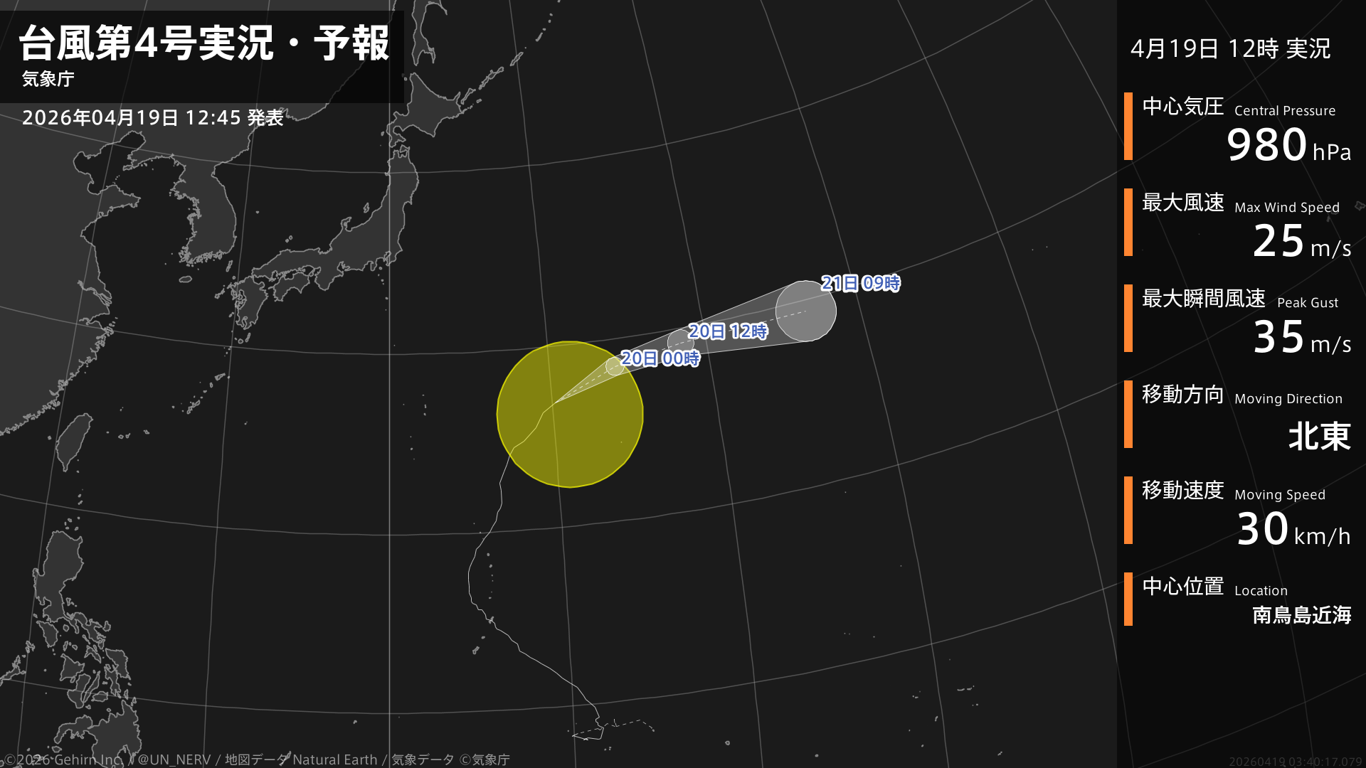 【台風第4号実況・予報 2026年04月19日 12:40】台風第4号(シンラコウ)は、南鳥島近海を1時間に30キロの速さで北東に進んでいます。#台風情報