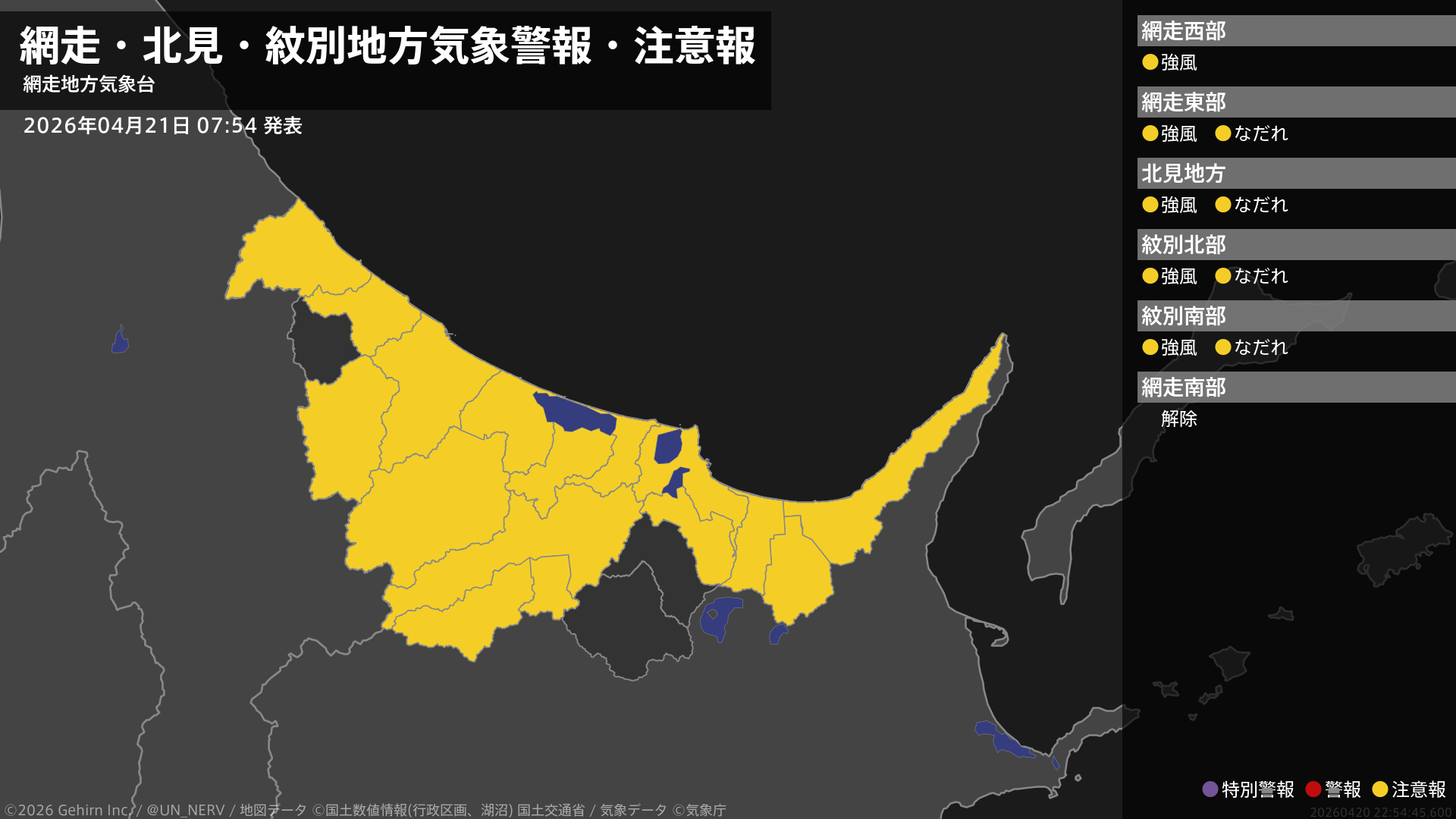 【網走・北見・紋別地方 気象警報・注意報 2026年04月21日 07:54】網走、北見、紋別地方では、21日夕方まで強風に、21日までなだれに注意してください。#気象警報注意報 #網走・北見・紋別地方