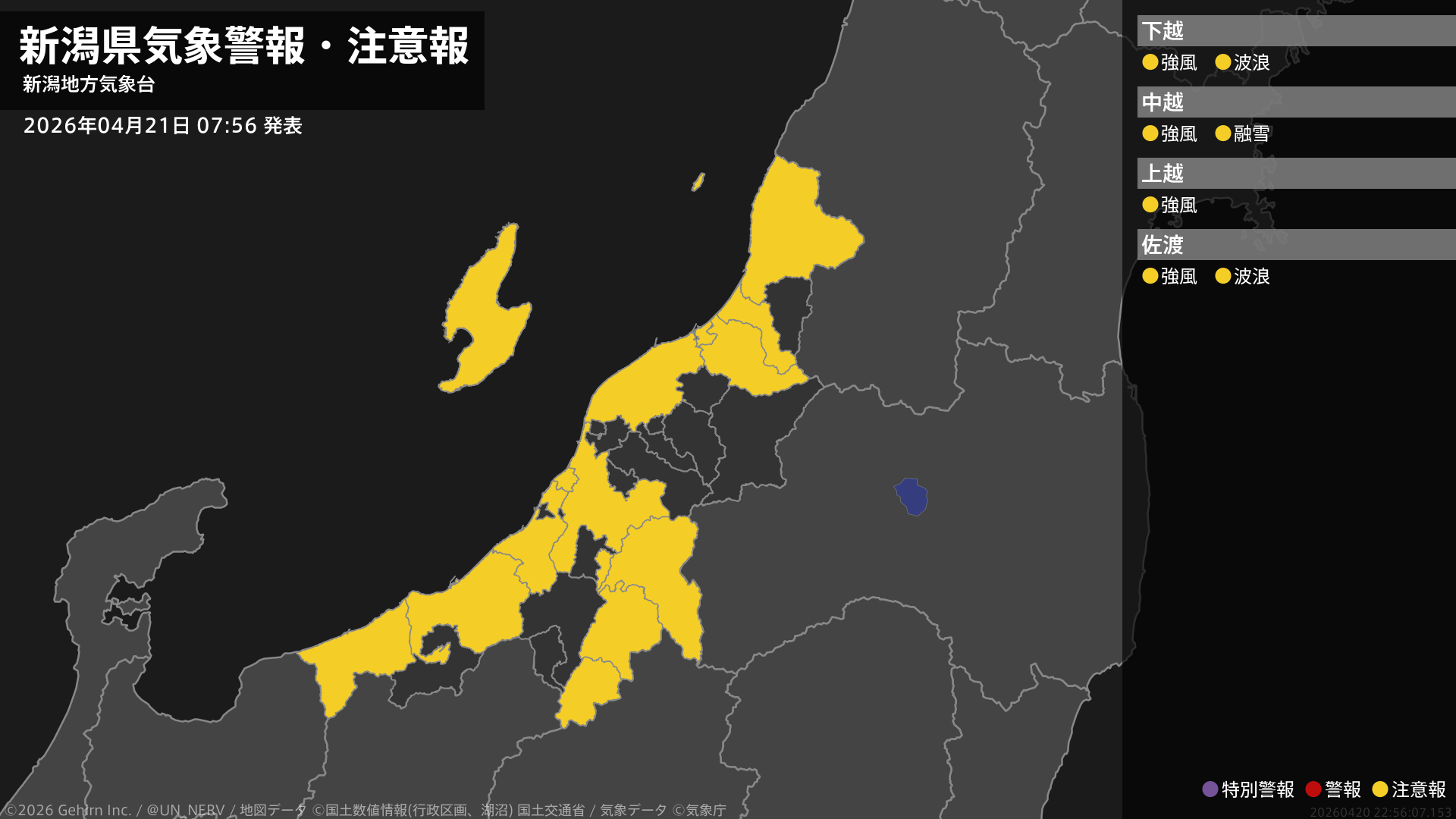 【新潟県 気象警報・注意報 2026年04月21日 07:56】新潟県では、強風に注意してください。下越、佐渡では、高波に注意してください。中越では、融雪による土砂災害に注意してください。#気象警報注意報 #新潟県
