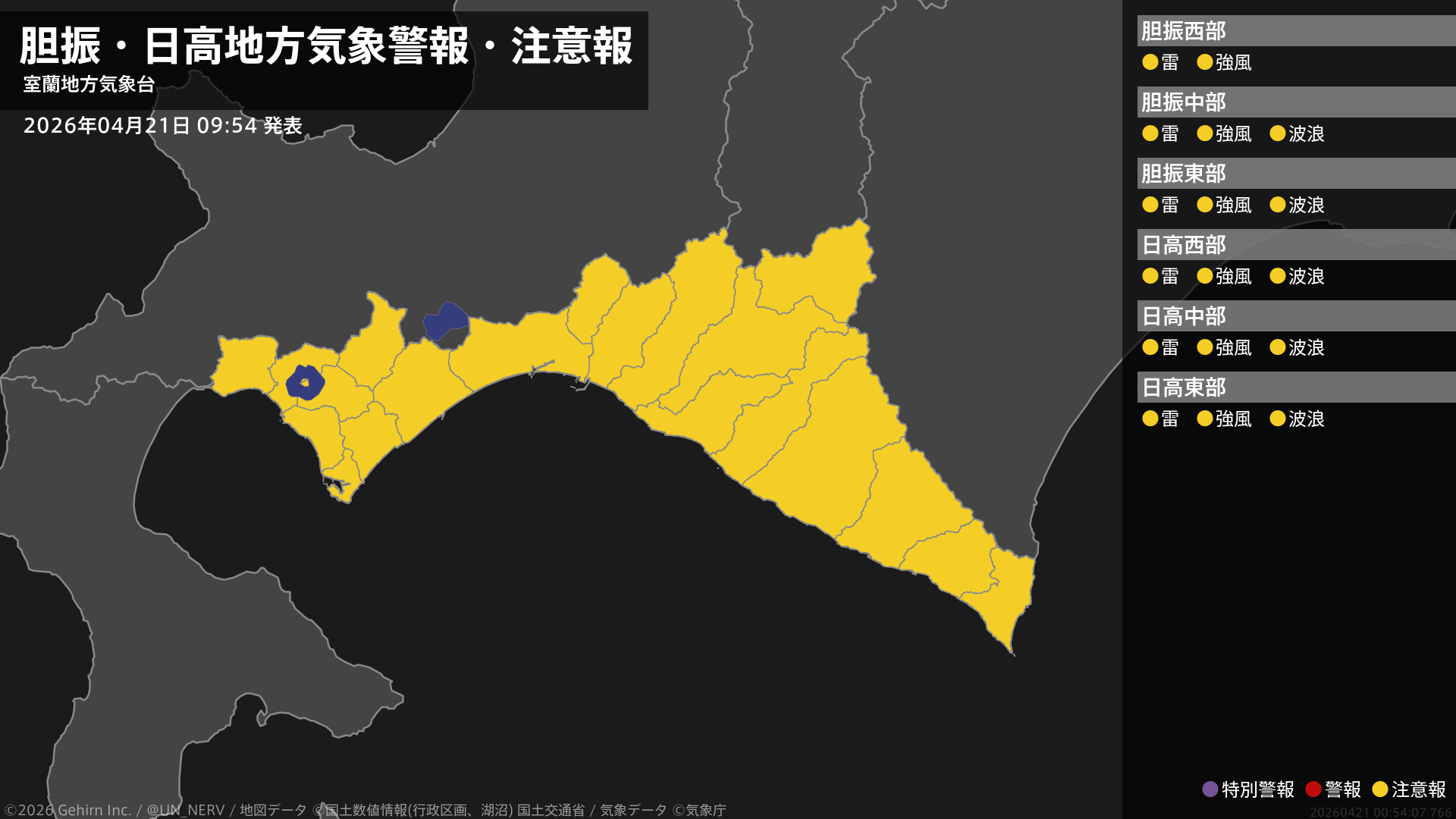 【胆振・日高地方 気象警報・注意報 2026年04月21日 09:54】胆振、日高地方では、強風や高波、竜巻などの激しい突風、急な強い雨、落雷に注意してください。#気象警報注意報 #胆振地方 #日高地方