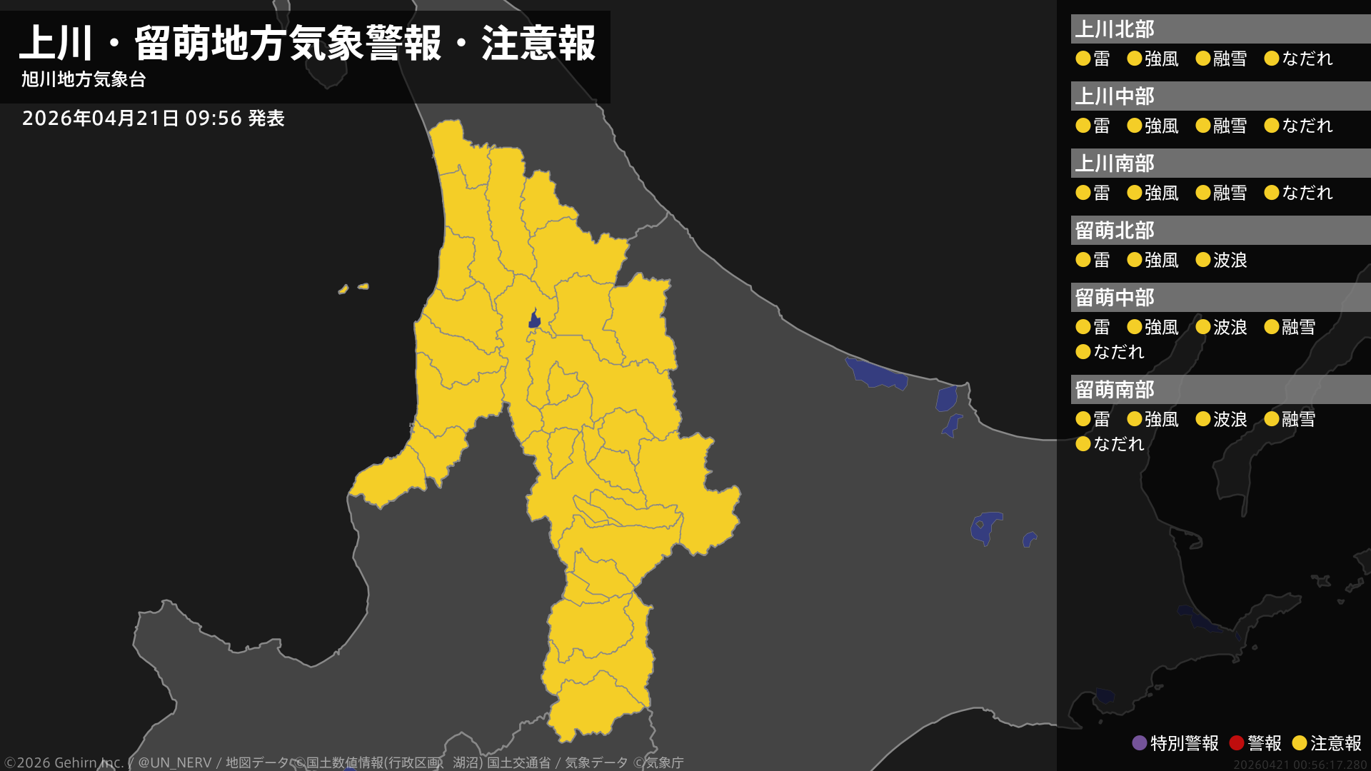 【上川・留萌地方 気象警報・注意報 2026年04月21日 09:56】上川、留萌地方では、強風や竜巻などの激しい突風、急な強い雨、落雷、融雪による土砂災害、なだれに注意してください。留萌地方では、高波に注意してください。#気象警報注意報 #上川地方 #留萌地方