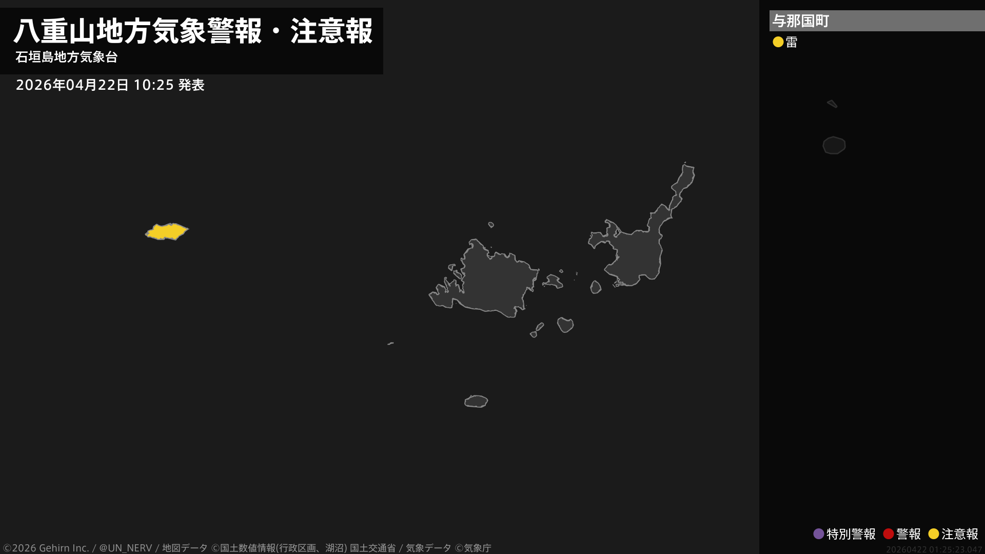 【八重山地方 気象警報・注意報 2026年04月22日 10:25】与那国島地方では、22日夕方から23日明け方まで急な強い雨や落雷に注意してください。#気象警報注意報 #八重山地方
