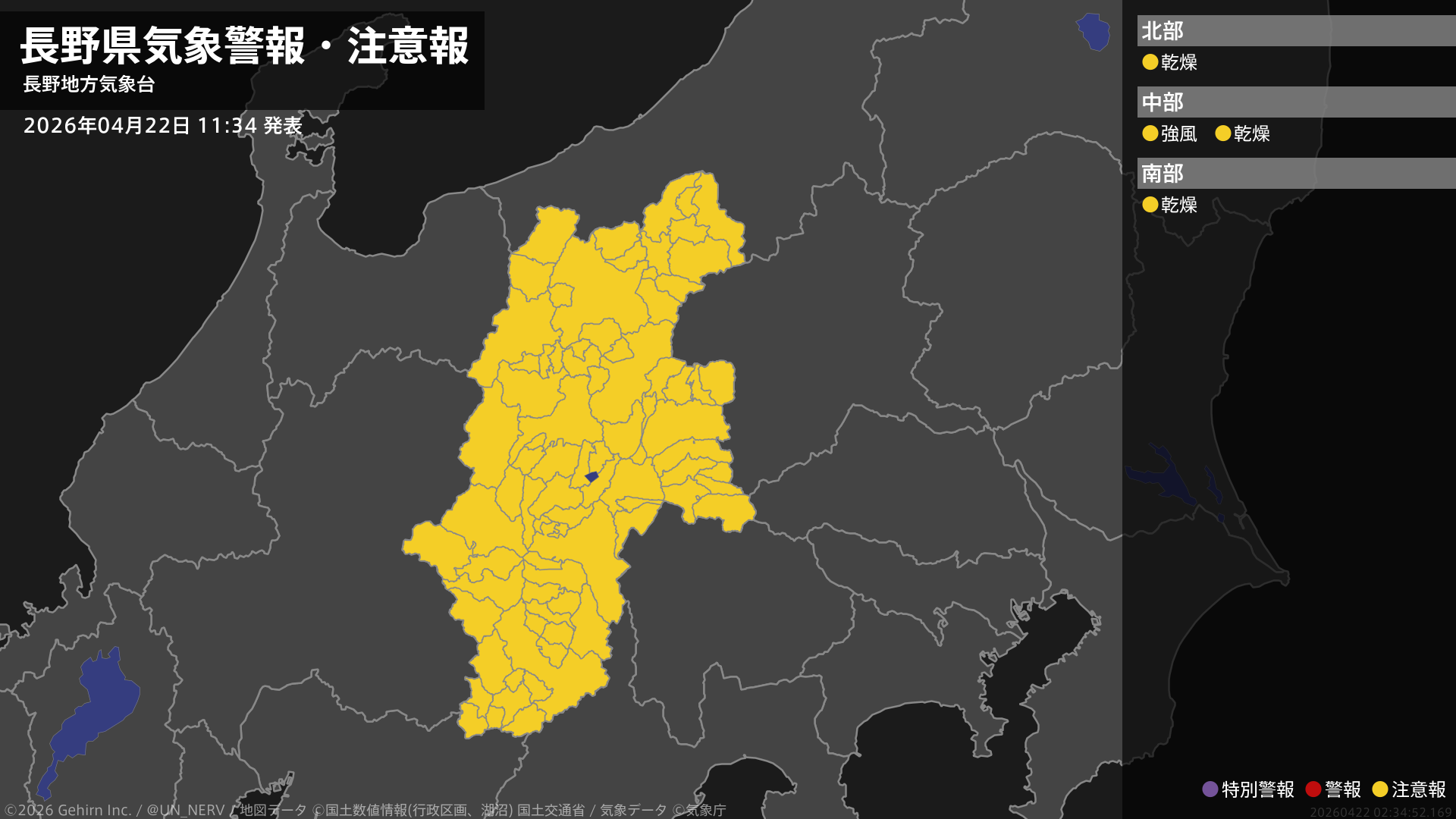 【長野県 気象警報・注意報 2026年04月22日 11:34】中部では、22日夜のはじめ頃まで強風に注意してください。長野県では、22日まで空気の乾燥した状態が続くため、火の取り扱いに注意してください。#気象警報注意報 #長野県