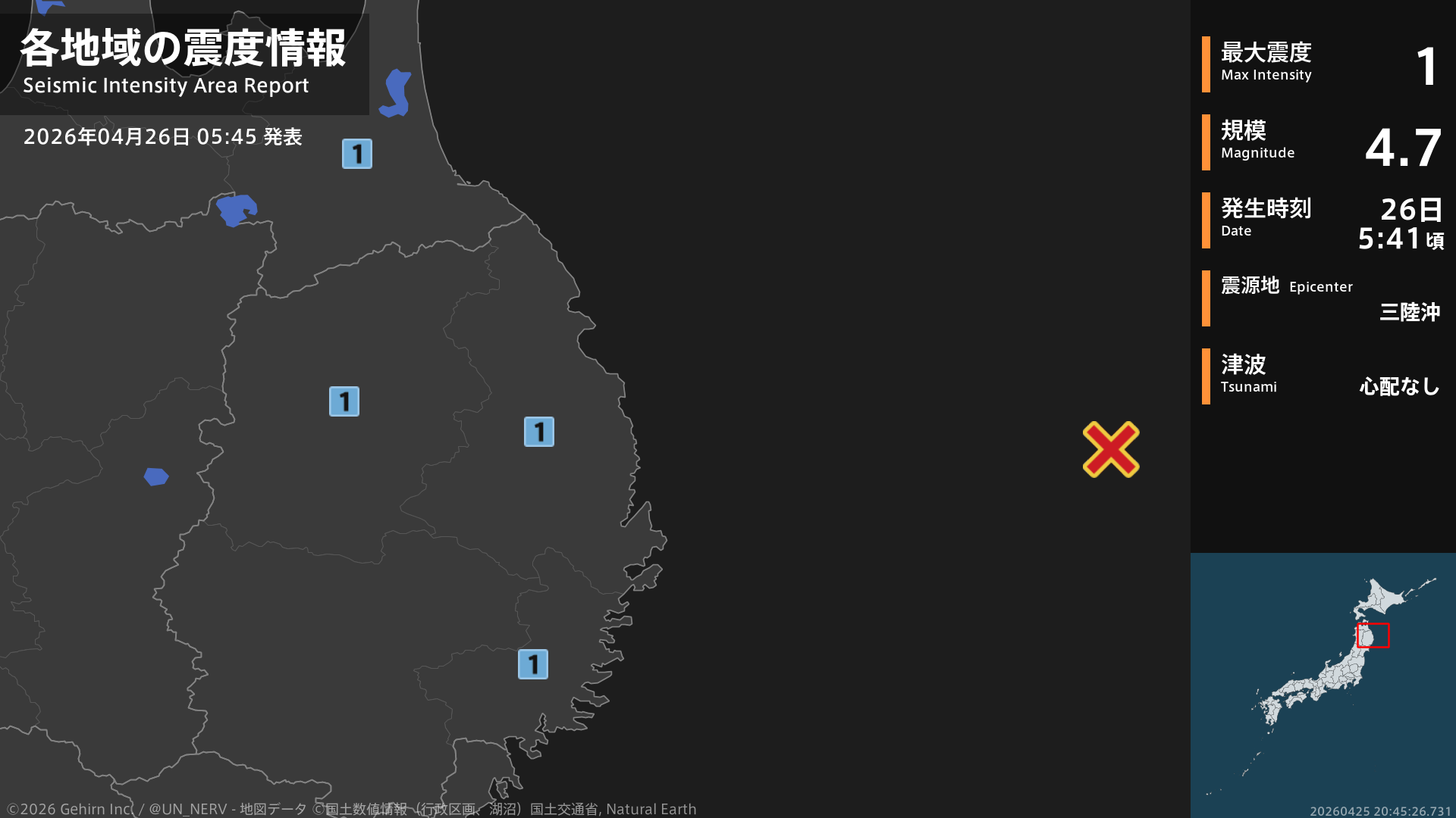 【地震情報 2026年4月26日】5時41分頃、三陸沖を震源とする地震がありました。震源の深さは約10km、地震の規模はM4.7、最大震度1を青森県、岩手県で観測しています。この地震による津波の心配はありません。#地震 #青森県 #岩手県