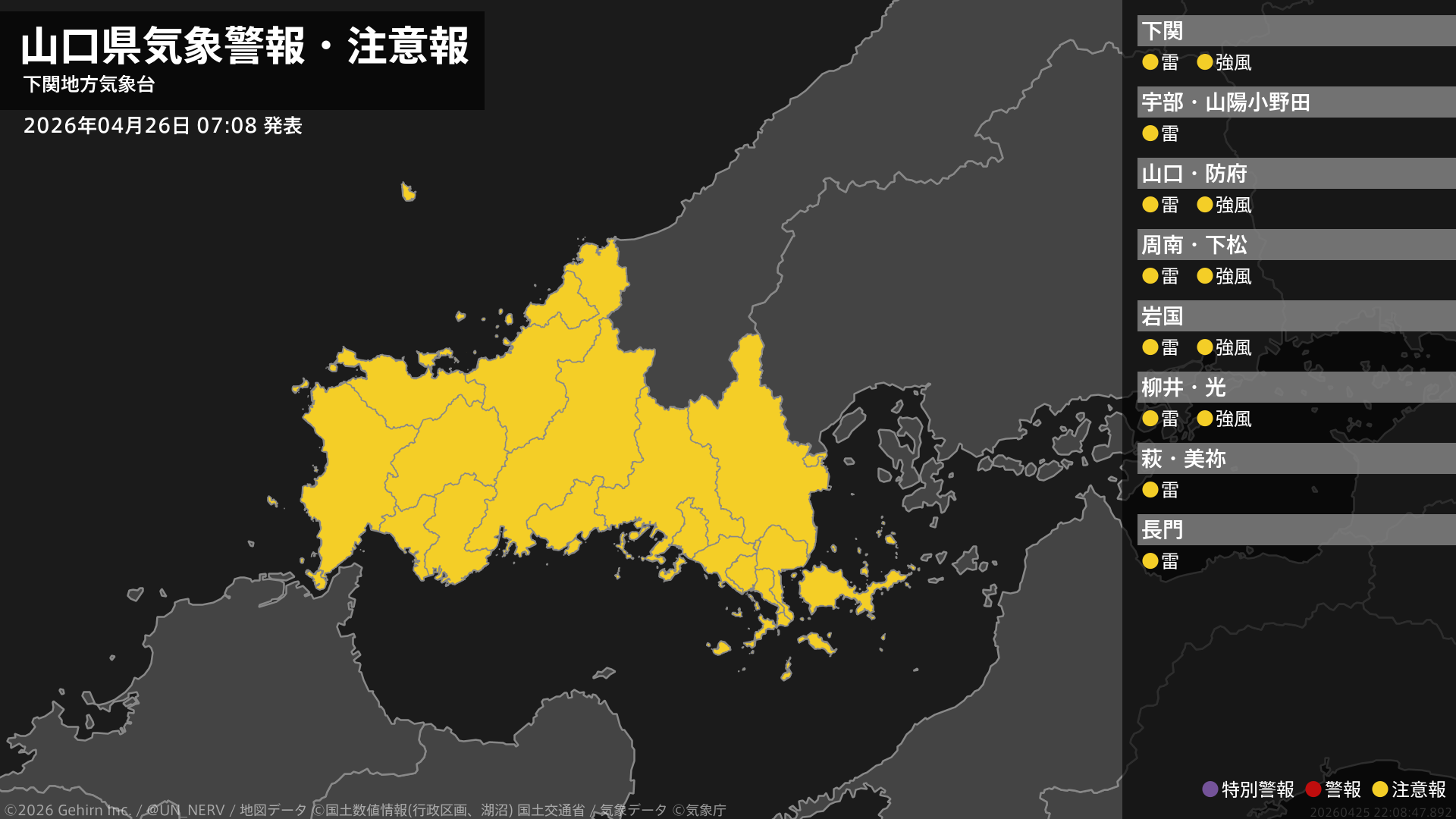 【山口県 気象警報・注意報 2026年04月26日 07:08】西部では26日昼前まで、中部、東部では26日昼過ぎから26日夜遅くまで、強風に注意してください。山口県では、26日昼過ぎから26日夕方まで急な強い雨や落雷に注意してください。#気象警報注意報 #山口県