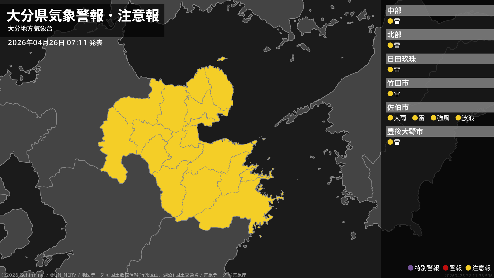 【大分県 気象警報・注意報 2026年04月26日 07:11】南部では、土砂災害や強風、高波に注意してください。大分県では、竜巻などの激しい突風や落雷に注意してください。#気象警報注意報 #大分県