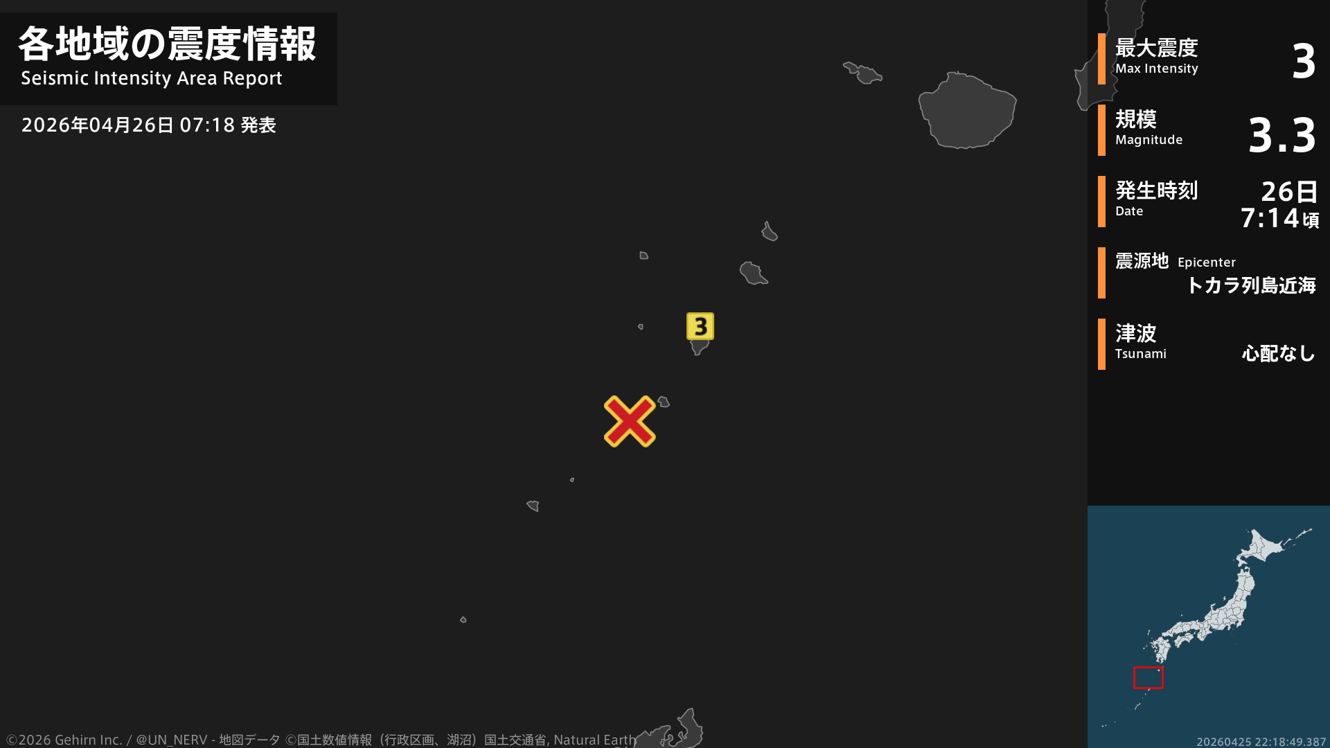 【地震情報 2026年4月26日】7時14分頃、トカラ列島近海を震源とする地震がありました。震源の深さは約20km、地震の規模はM3.3、最大震度3を鹿児島県で観測しています。この地震による津波の心配はありません。#地震 #鹿児島県