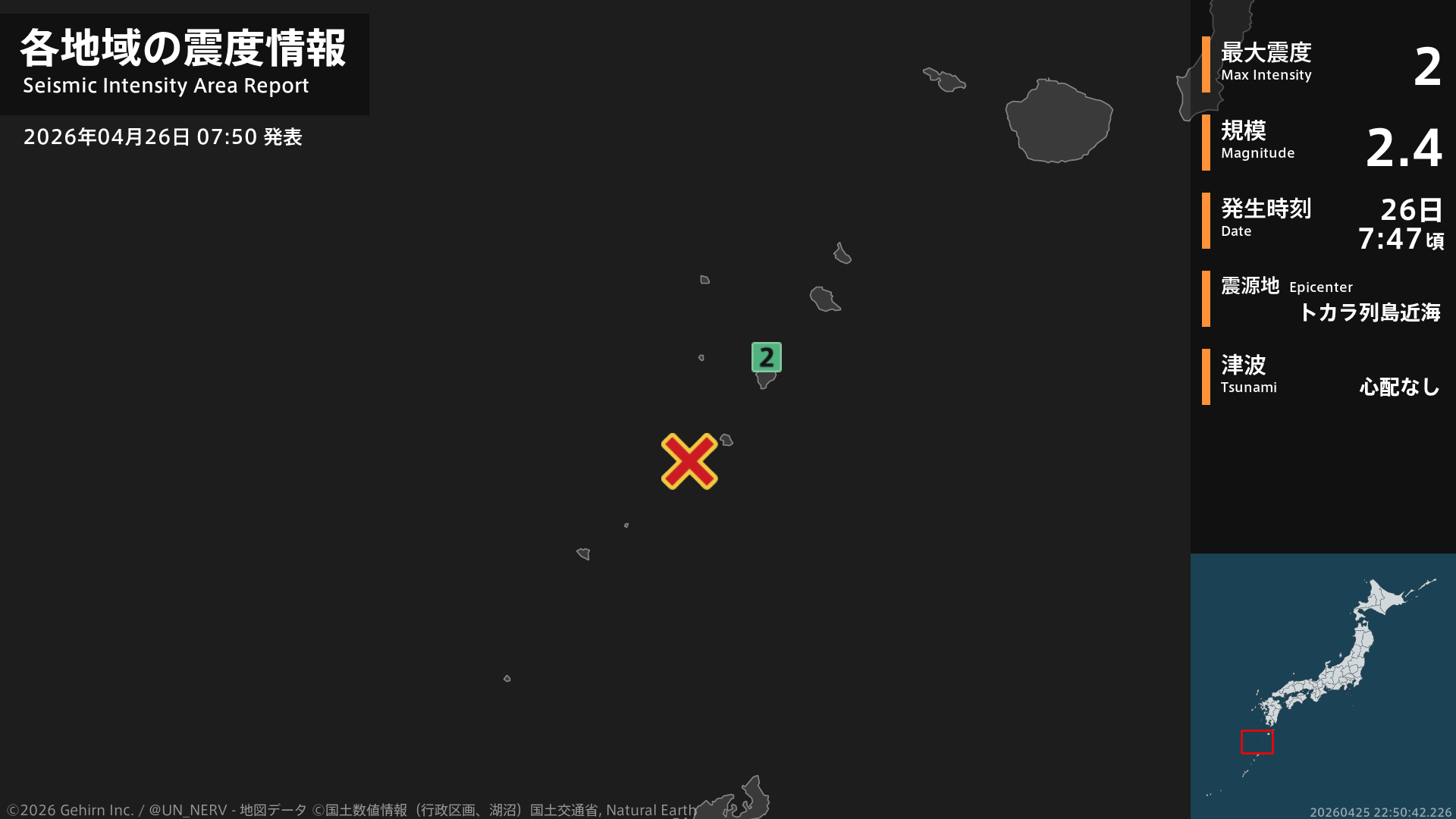 【地震情報 2026年4月26日】7時47分頃、トカラ列島近海を震源とする地震がありました。震源の深さは約20km、地震の規模はM2.4、最大震度2を鹿児島県で観測しています。この地震による津波の心配はありません。#地震 #鹿児島県