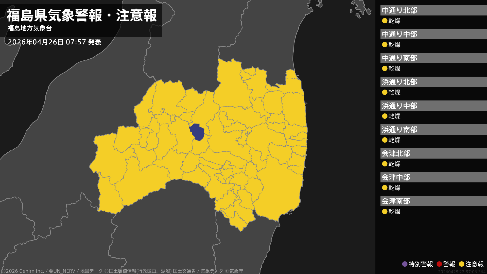 【福島県 気象警報・注意報 2026年04月26日 07:57】福島県では、26日まで空気の乾燥した状態が続くため、火の取り扱いに注意してください。#気象警報注意報 #福島県