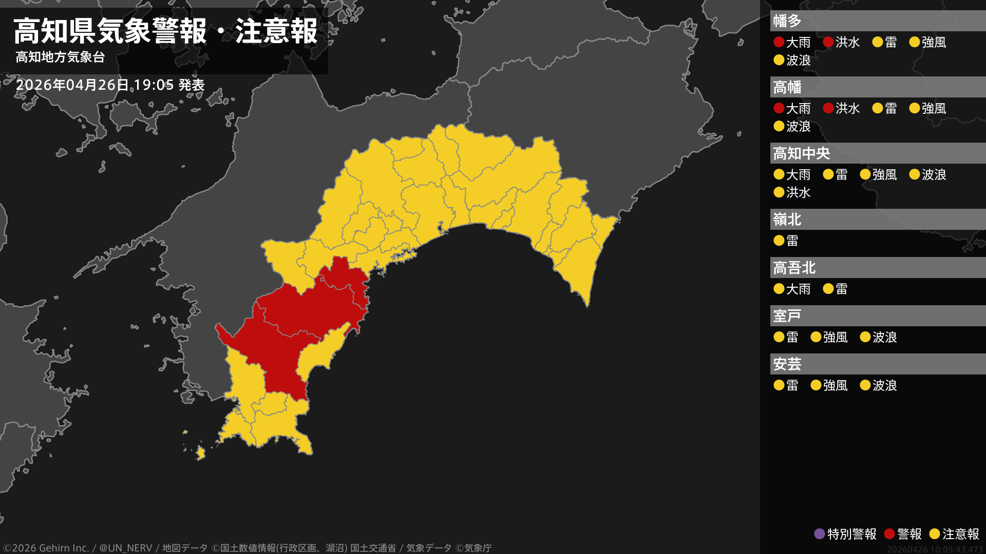 【高知県 気象警報・注意報 2026年04月26日 19:05】西部では、26日夜のはじめ頃まで低い土地の浸水や河川の増水に警戒してください。#気象警報注意報 #高知県