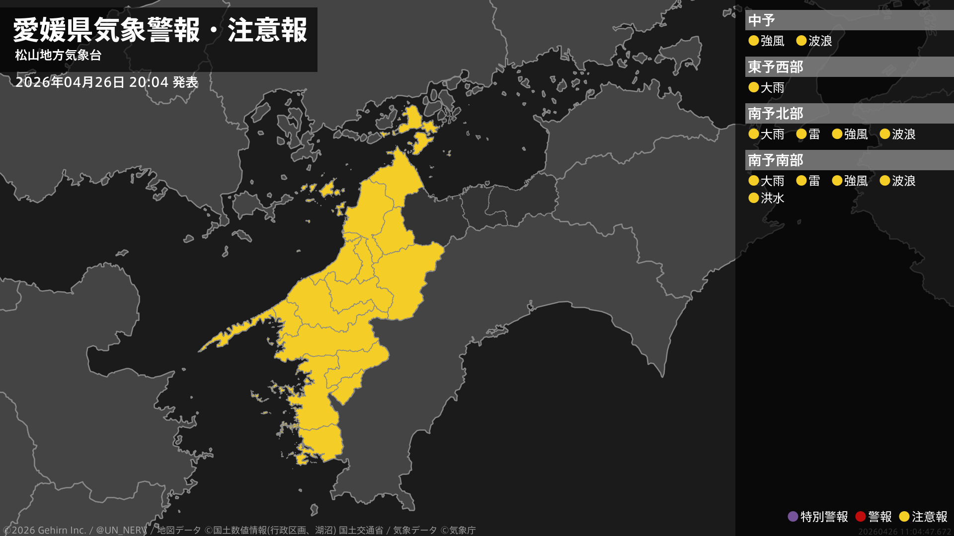 【愛媛県 気象警報・注意報 2026年04月26日 20:04】東予、南予では、土砂災害に注意してください。南予では、河川の増水や落雷に注意してください。中予、南予では、強風や高波に注意してください。#気象警報注意報 #愛媛県