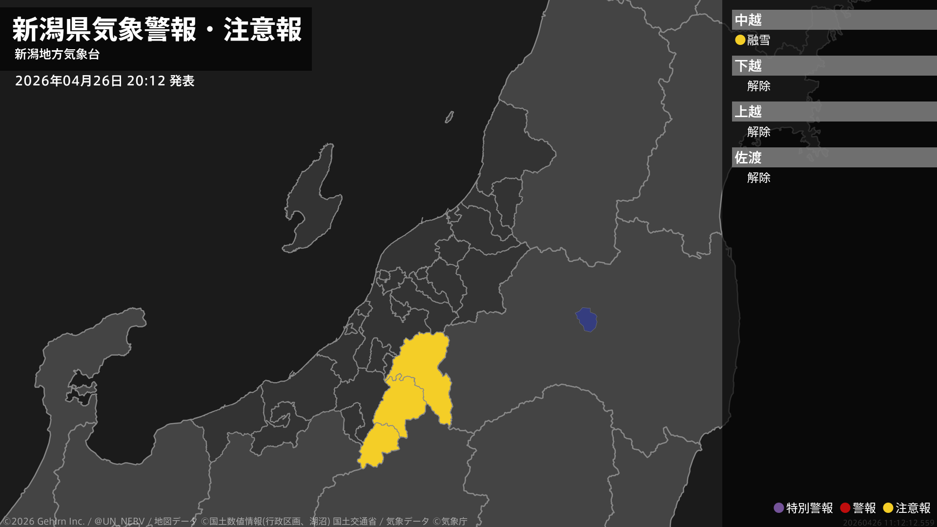 【新潟県 気象警報・注意報 2026年04月26日 20:12】中越では、融雪による土砂災害に注意してください。#気象警報注意報 #新潟県