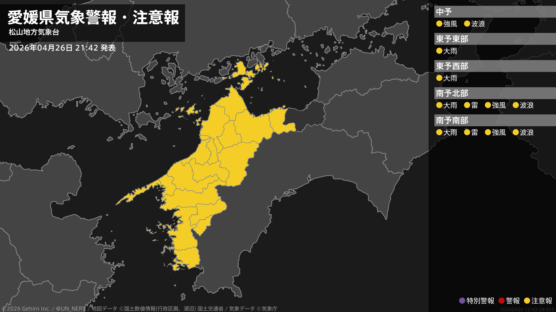 【愛媛県 気象警報・注意報 2026年04月26日 21:42】東予、南予では、27日明け方まで土砂災害に注意してください。中予、南予では、26日夜遅くまで強風や高波に注意してください。南予では、26日夜遅くまで落雷に注意してください。#気象警報注意報 #愛媛県