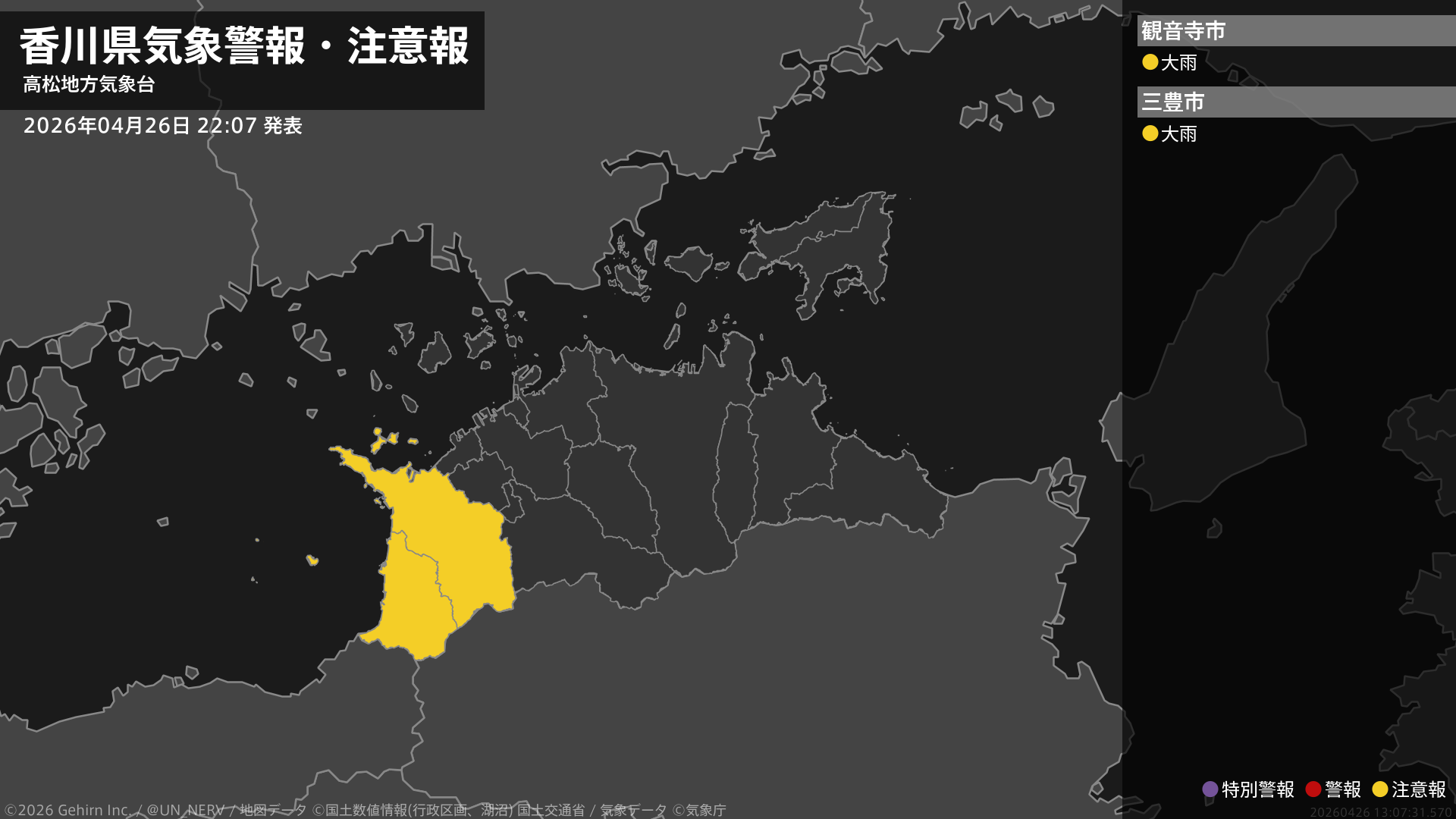 【香川県 気象警報・注意報 2026年04月26日 22:07】香川県では、27日明け方まで土砂災害に注意してください。#気象警報注意報 #香川県