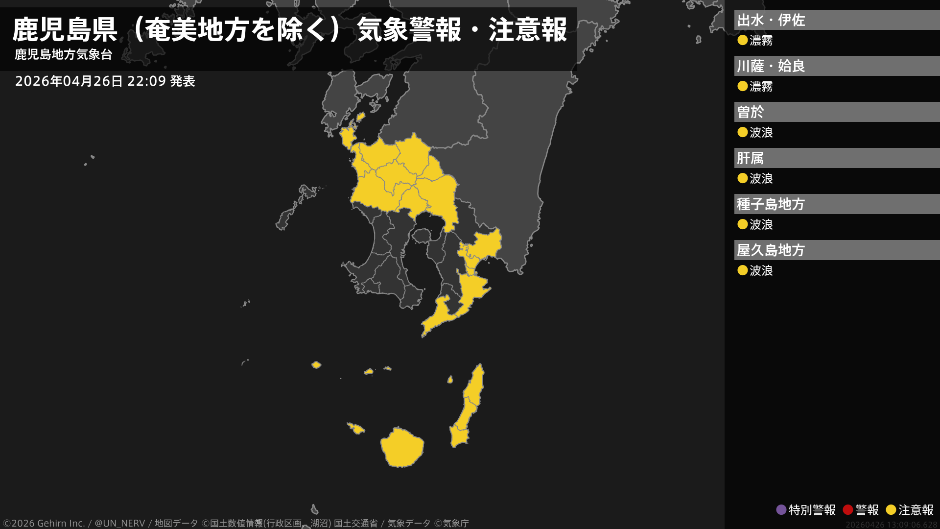 【鹿児島県(奄美地方を除く) 気象警報・注意報 2026年04月26日 22:09】大隅、種子島・屋久島地方では、27日明け方まで高波に注意してください。薩摩地方では、27日昼前まで濃霧による視程障害に注意してください。#気象警報注意報 #鹿児島県(奄美地方除く)