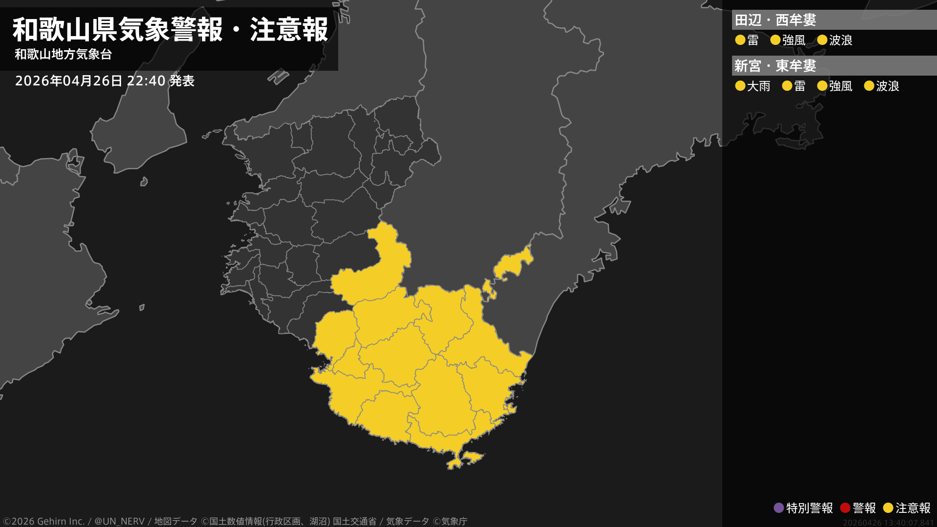 【和歌山県 気象警報・注意報 2026年04月26日 22:40】南部では、27日明け方まで低い土地の浸水や強風、高波、落雷に注意してください。#気象警報注意報 #和歌山県