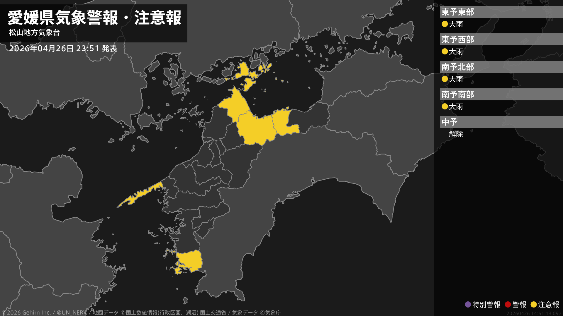 【愛媛県 気象警報・注意報 2026年04月26日 23:51】東予、南予では、27日明け方まで土砂災害に注意してください。#気象警報注意報 #愛媛県