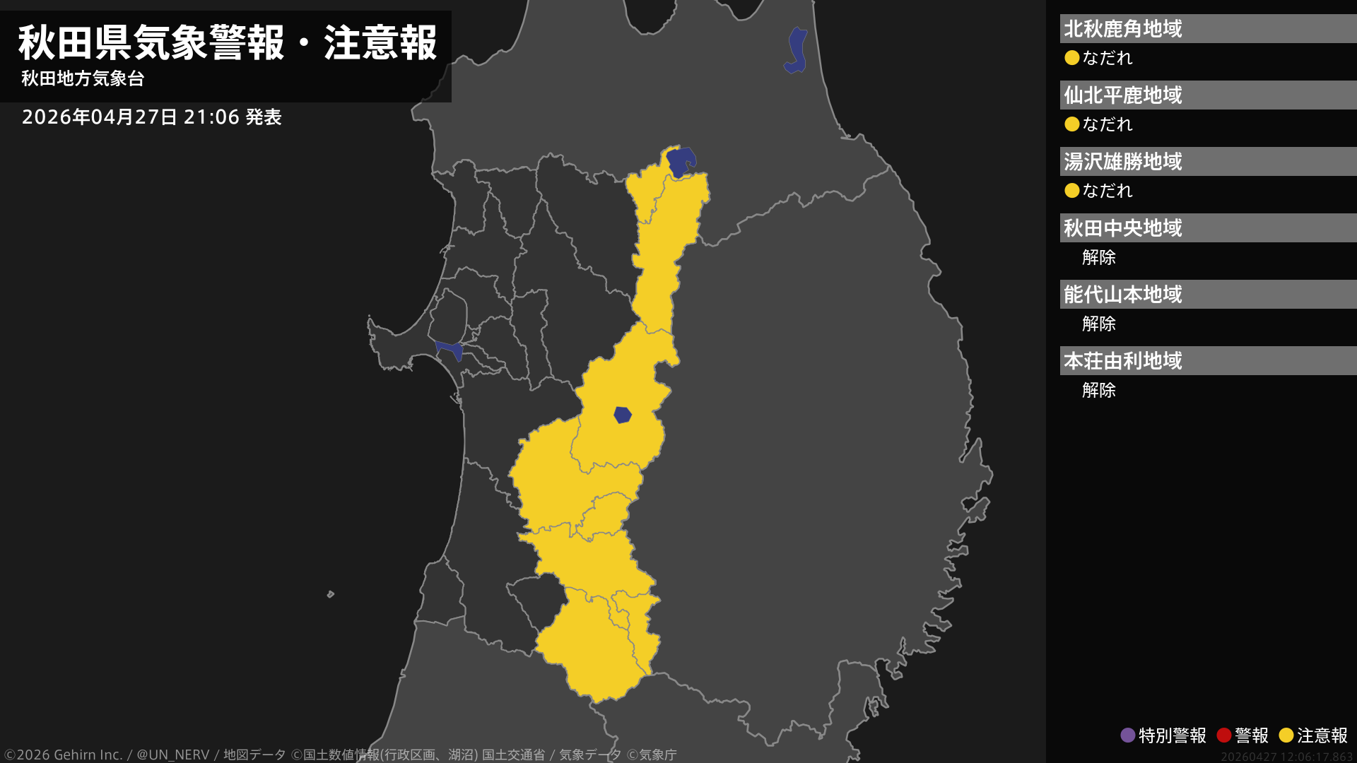 【秋田県 気象警報・注意報 2026年04月27日 21:06】内陸では、ここしばらくなだれに注意してください。#気象警報注意報 #秋田県