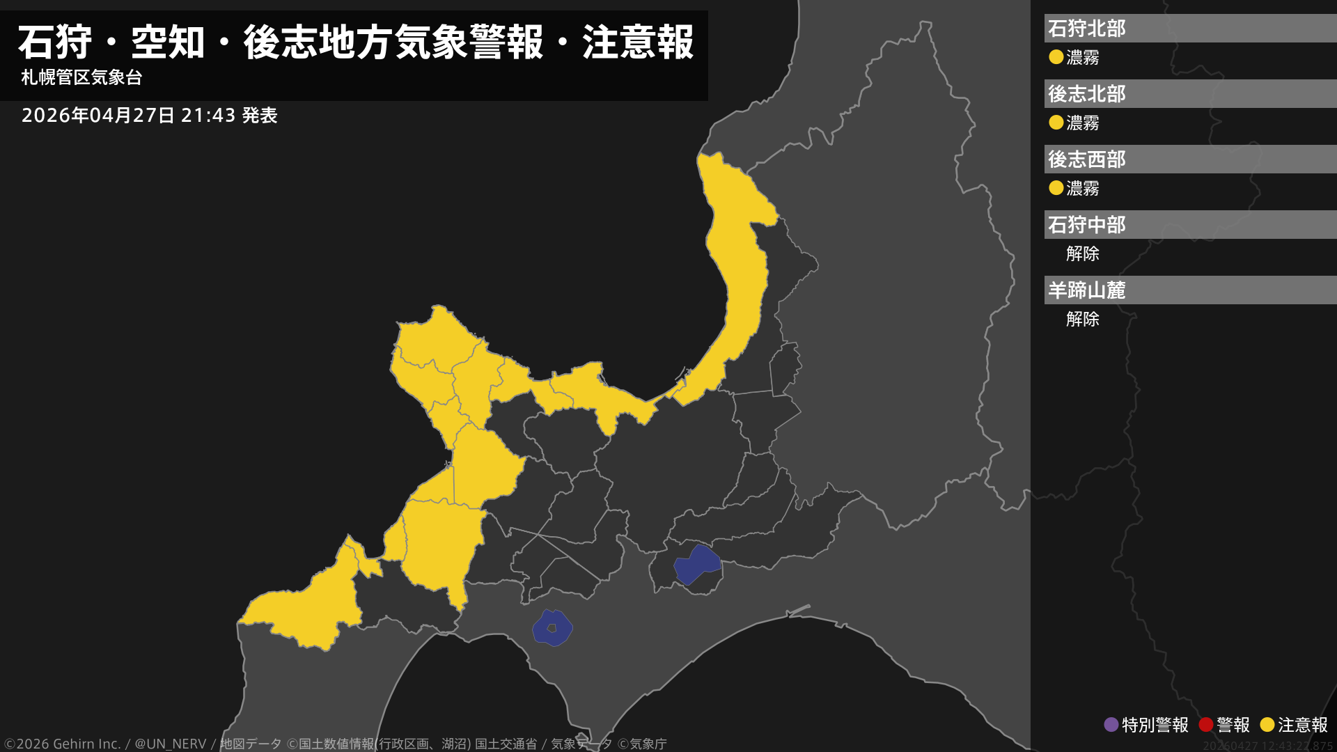 【石狩・空知・後志地方 気象警報・注意報 2026年04月27日 21:43】石狩、後志地方では、28日昼前まで濃霧による視程障害に注意してください。#気象警報注意報 #石狩地方 #後志地方