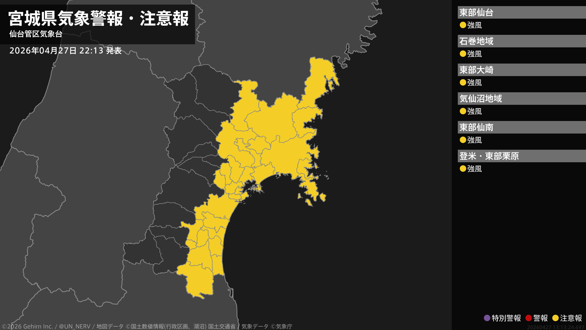 【宮城県 気象警報・注意報 2026年04月27日 22:13】東部では、28日明け方まで強風に注意してください。#気象警報注意報 #宮城県