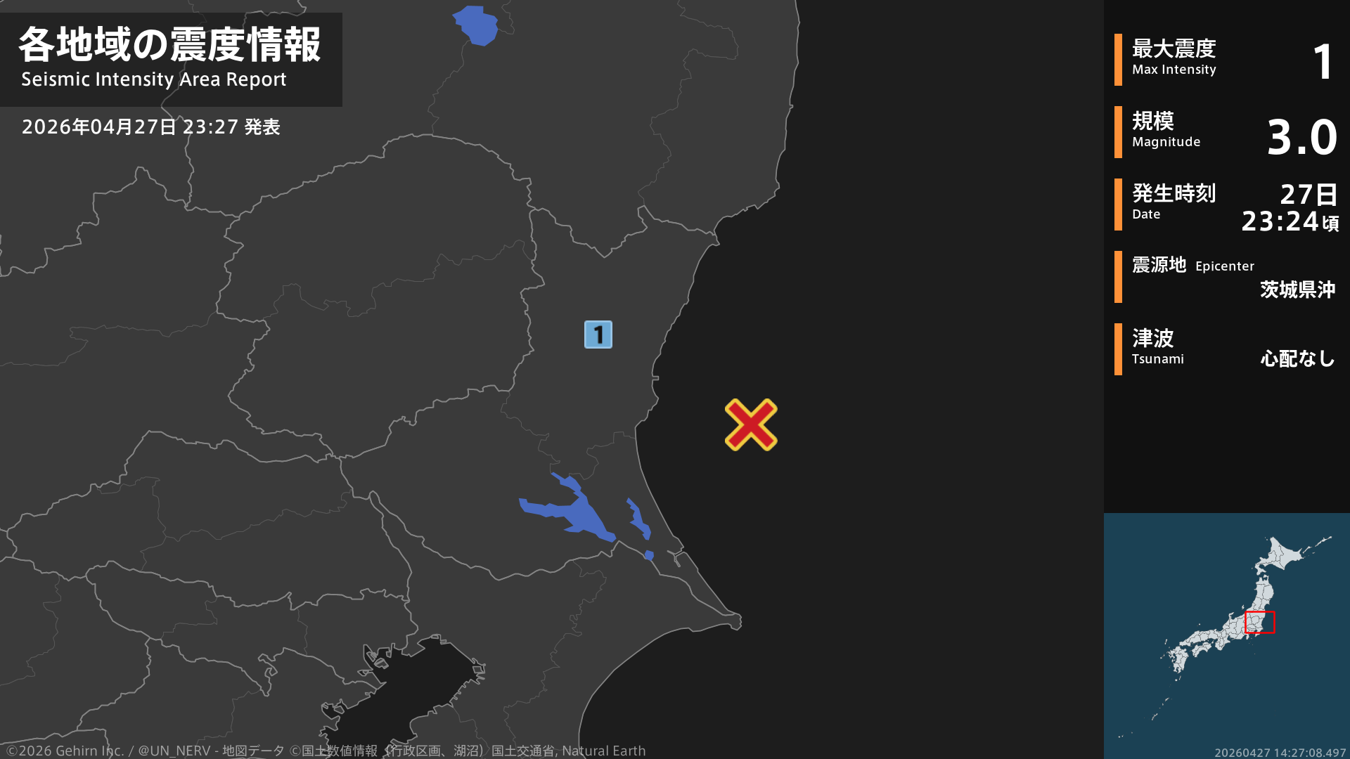 【地震情報 2026年4月27日】23時24分頃、茨城県沖を震源とする地震がありました。震源の深さは約30km、地震の規模はM3.0、最大震度1を茨城県で観測しています。この地震による津波の心配はありません。#地震 #茨城県