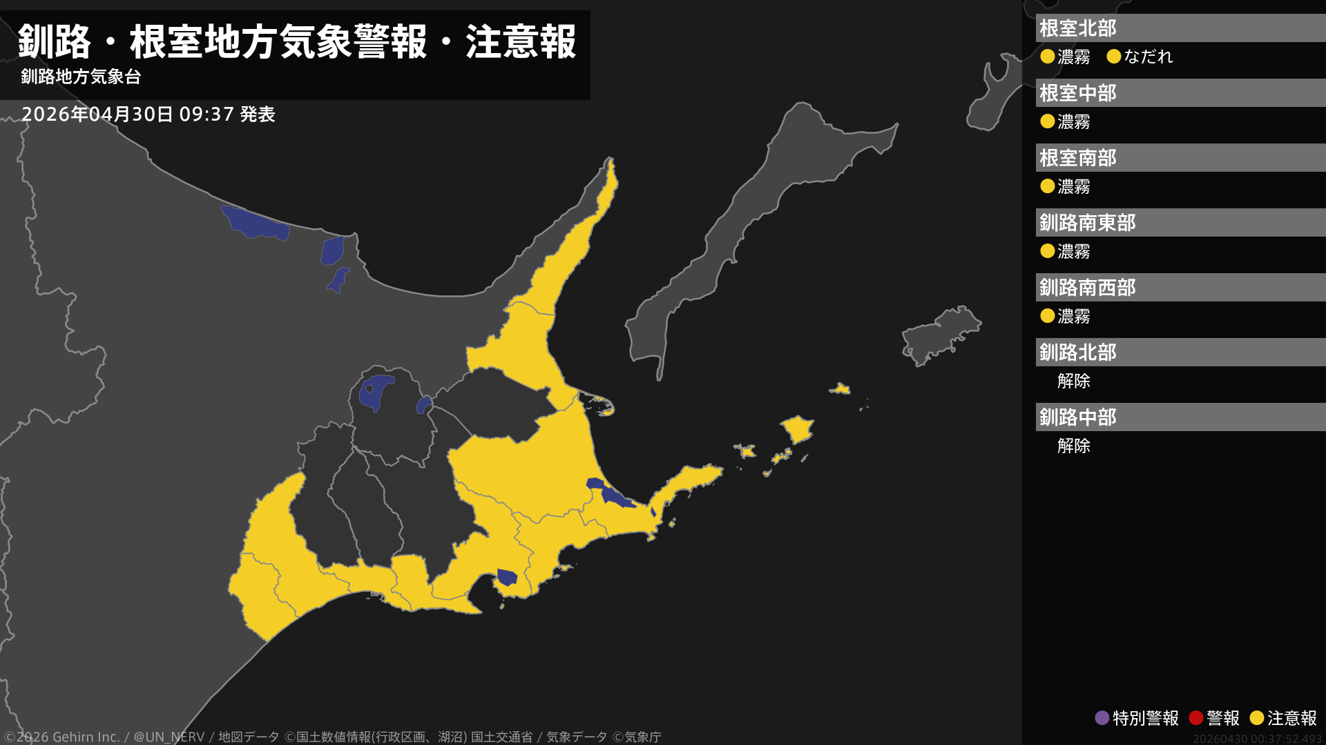 【釧路・根室地方 気象警報・注意報 2026年04月30日 09:37】根室、釧路地方では、30日夕方まで濃霧による視程障害に注意してください。根室地方では、1日までなだれに注意してください。#気象警報注意報 #根室地方 #釧路地方