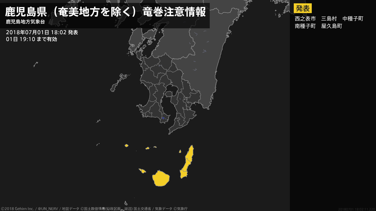 【鹿児島県(奄美地方を除く) 竜巻注意情報】鹿児島県(奄美地方を除く)は、竜巻などの激しい突風が発生しやすい気象状況になっています。頑丈な建物内に移動するなど安全確保に努めてください。この情報は01日19:10まで有効です。#竜巻注意情報 #鹿児島県(奄美地方除く)