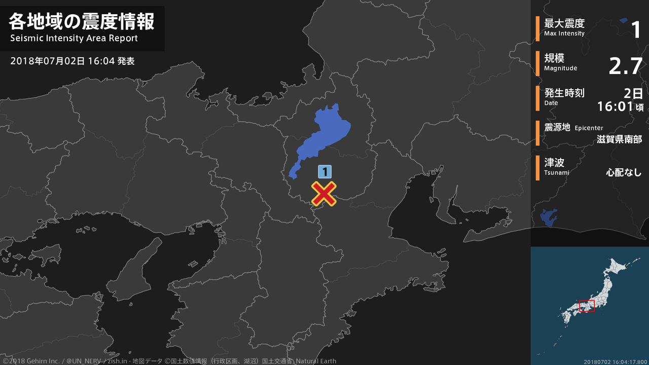 【地震情報 2018年7月2日】16時1分頃、滋賀県南部を震源とする地震がありました。震源の深さは約10km、地震の規模はM2.7、最大震度1を滋賀県で観測しています。この地震による津波の心配はありません。#地震 #滋賀県