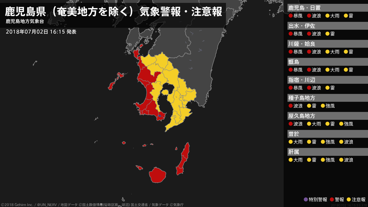 【鹿児島県(奄美地方を除く) 気象警報 2018年07月02日 16:16】鹿児島県(奄美地方を除く)に気象警報が発表されています。#気象警報 #気象警報注意報 #鹿児島県(奄美地方除く)