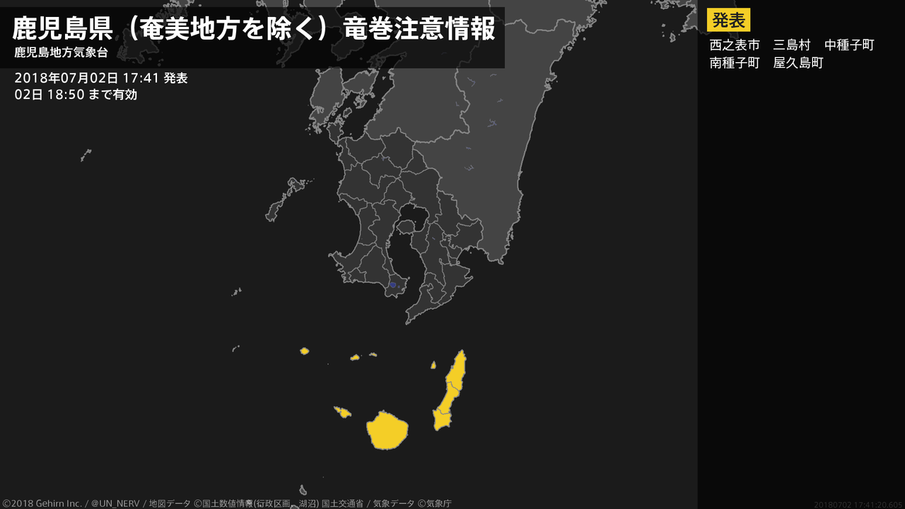 【奄美地方(鹿児島県) 気象警報・注意報 2018年07月02日 18:04】奄美地方では、2日夜遅くまで暴風に、3日朝まで高波に警戒してください。#気象警報注意報 #奄美地方