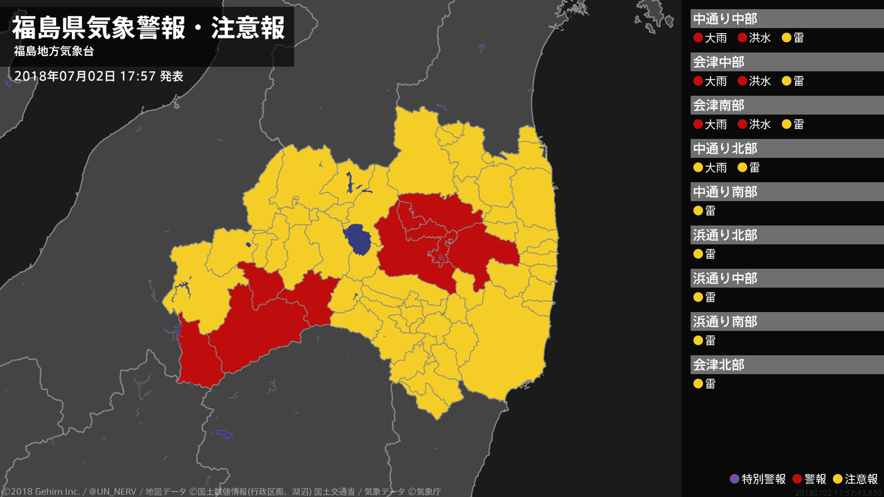 【福島県 気象警報・注意報 2018年07月02日 17:57】中通り、会津では、2日夜のはじめ頃まで土砂災害や低い土地の浸水、河川の増水に警戒してください。#気象警報注意報 #福島県