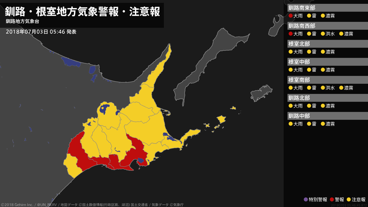 【釧路・根室地方 気象警報・注意報 2018年07月03日 05:23】根室、釧路地方では、土砂災害や低い土地の浸水、河川の増水、落雷、濃霧による視程障害に注意してください。#気象警報注意報 #根室地方 #釧路地方