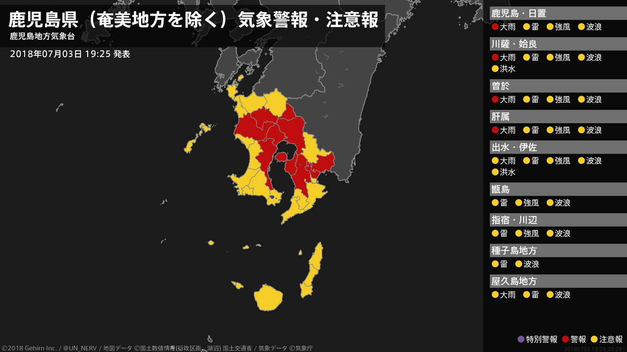【鹿児島県(奄美地方を除く) 気象警報 2018年07月03日 19:25】薩摩、大隅地方では、3日夜遅くまで土砂災害に警戒してください。#気象警報 #気象警報注意報 #鹿児島県(奄美地方除く)