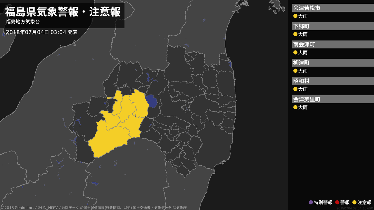 【福島県 気象警報・注意報 2018年07月04日 03:04】会津では、4日昼前まで土砂災害に注意してください。#気象警報注意報 #福島県
