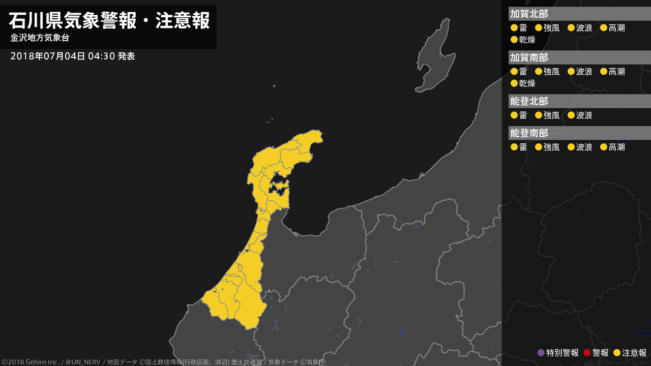 【石川県 気象警報・注意報 2018年07月04日 04:30】