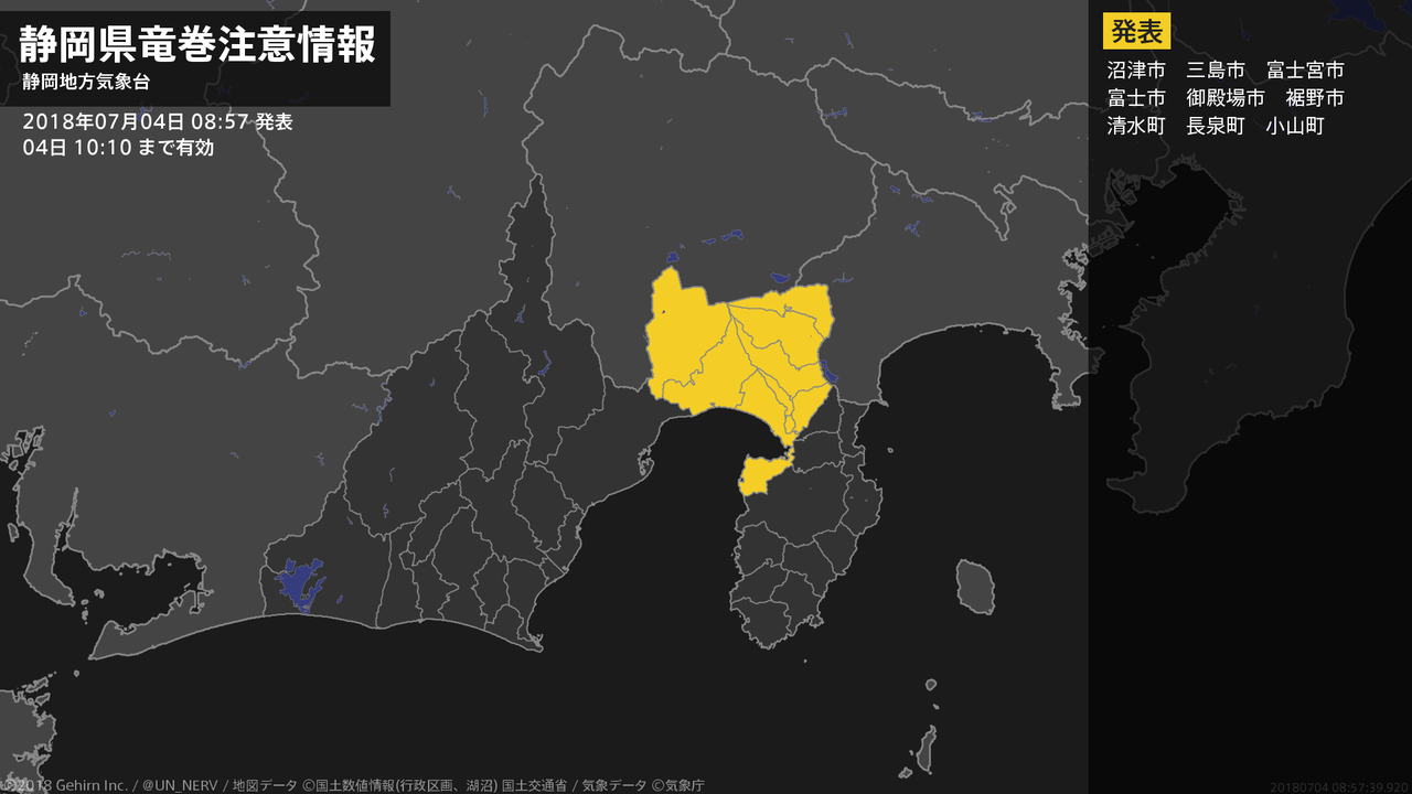 【静岡県 竜巻注意情報】静岡県は、竜巻などの激しい突風が発生しやすい気象状況になっています。頑丈な建物内に移動するなど安全確保に努めてください。この情報は04日10:10まで有効です。#竜巻注意情報 #静岡県