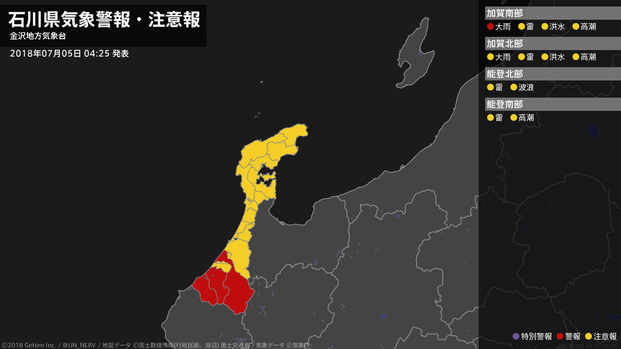 【石川県 気象警報・注意報 2018年07月05日 04:25】加賀では、5日夜遅くまで土砂災害に警戒してください。#気象警報注意報 #石川県