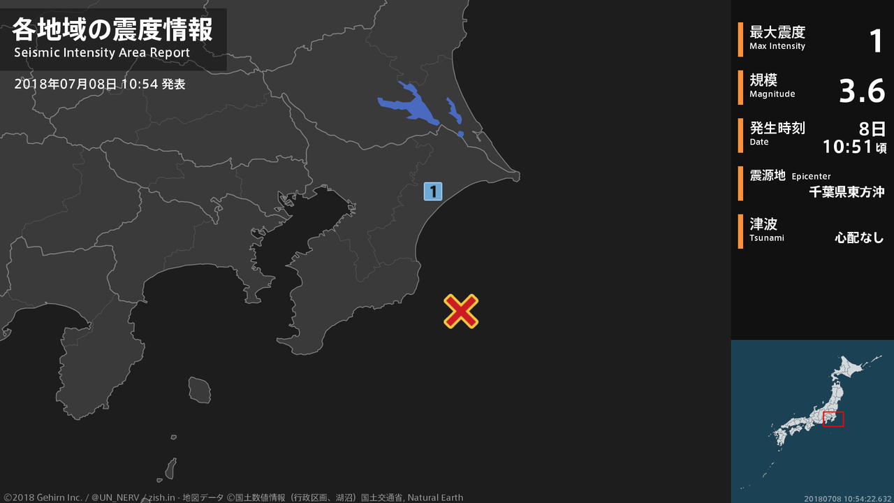 10時51分頃、千葉県東方沖を震源とする地震がありました。震源の深さは約60km、地震の規模はM3.6、最大震度1を千葉県で観測しています。この地震による津波の心配はありません。