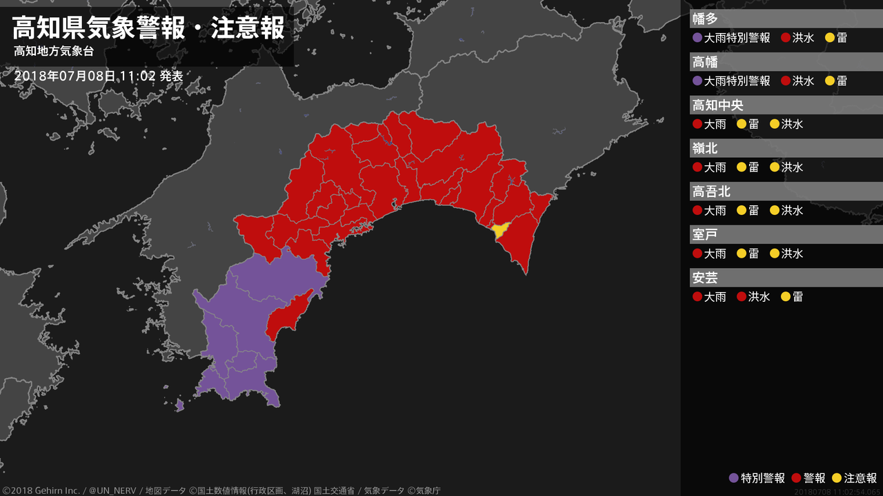 【高知県 気象警報・注意報 2018年07月08日 11:03】