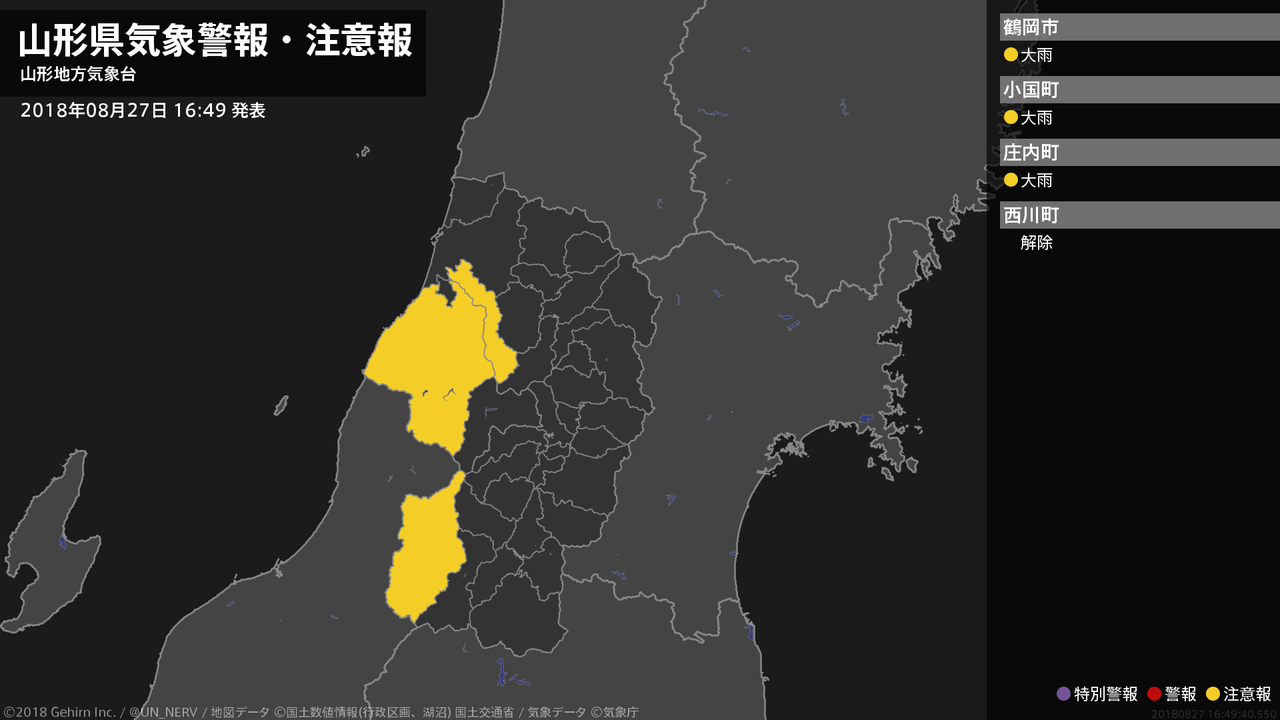 【山形県 気象警報・注意報 2018年08月27日 16:49】置賜、庄内では、27日夜遅くまで土砂災害に注意してください。#気象警報注意報 #山形県