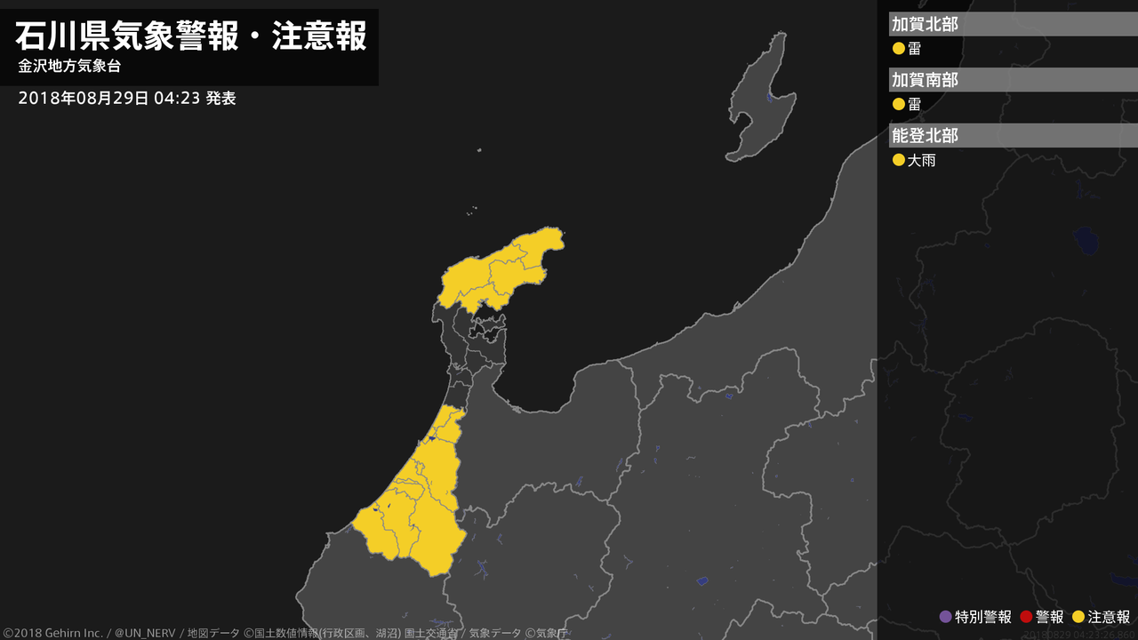 【石川県 気象警報・注意報 2018年08月29日 04:23】能登では、29日昼前まで土砂災害に注意してください。加賀では、29日明け方まで落雷に注意してください。#気象警報注意報 #石川県