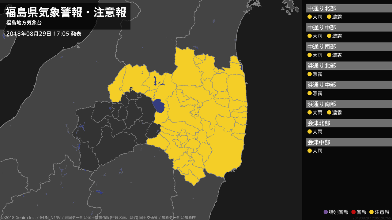 【福島県 気象警報・注意報 2018年08月29日 17:05】福島県では、29日夜のはじめ頃まで土砂災害に注意してください。浜通りでは30日昼前まで、中通りでは29日夜のはじめ頃から30日昼前まで、濃霧による視程障害に注意してください。#気象警報注意報 #福島県